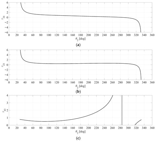 where ω3 is expressed by Equation (8). Figure 3c shows another configuration with links 4 and 3 as the input and output links, respectively. One has the angular velocity ratio τ43