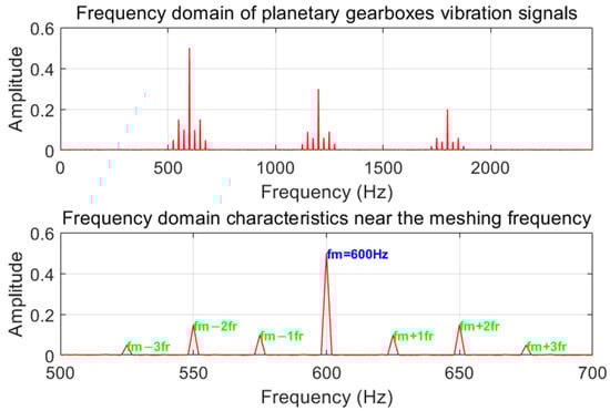 Vibration signals in planetary gearboxes are predominantly characterized by harmonic components resulting from gear meshing dynamics. These components typically manifest as the fundamental gear meshing frequency and its harmonics. During operational fault development, characteristic sideband components frequently emerge surrounding these primary meshing frequencies [48], as depicted in Figure 1. Both the meshing frequencies and their corresponding sidebands which have symmetry represent essential diagnostic signatures for fault identification.