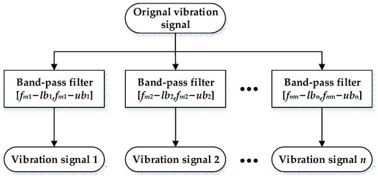 Due to the complex kinematic structure of planetary gearboxes, their vibration signals exhibit numerous meshing frequency harmonics and intricate sideband patterns [5]. To effectively extract diagnostic information embedded within these meshing frequency components and associated sidebands, an adaptive multi-bandpass filter (AMBPF) is proposed for signal separation in this paper. This approach isolates individual meshing frequency constituents and their corresponding sideband structures for independent feature extraction. The schematic diagram of the proposed AMBPF is illustrated in Figure 2.