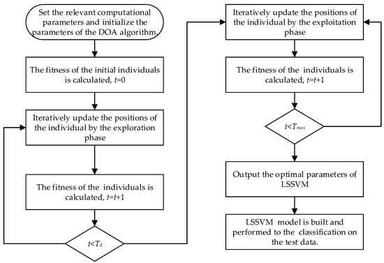 The DOA is employed to optimize the parameters and , aiming to enhance its classification efficiency. Meanwhile, 10-fold cross-validation is applied to the sample data as the objective function for parameter optimization to improve the generalization ability of LSSVM classification. The specific process is illustrated in Figure 3.
