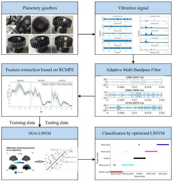 In this paper, a feature extraction method based on AMBPF and RCMFE is proposed and the DOA-LSSVM is also proposed to enhance classification efficiency. The framework diagram of the planetary gearbox fault diagnosis method proposed in this paper is illustrated in Figure 4.
