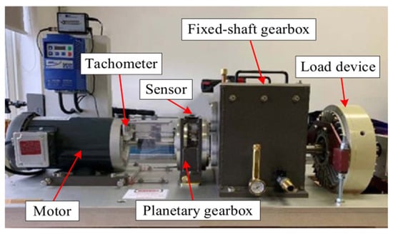 The publicly accessible dataset named ‘WT-Planetary gearbox dataset’, which is provided by Liu et al. [1], was utilized to validate the proposed fault diagnosis method in this paper. The vibration dataset can be obtained at the following link: https://github.com/Liudd-BJUT/WT-planetary-gearbox-dataset (accessed on 5 November 2024). The vibration signals of this dataset were collected from a planetary gearbox with a single-row planetary gear structure using an experimental test setup. The experimental setup is composed of a drive motor, a planetary gearbox, a fixed-shaft gearbox, a load, and a vibration signal measurement and acquisition device, whose structure is shown in Figure 5 [1]. The intrinsic parameters of the planetary gearbox, operating parameters, and parameters of the sampling device are listed in Table 1.