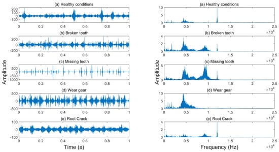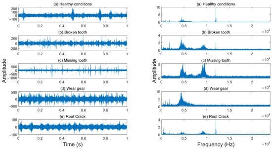 The experimental setup was used to acquire vibration data of the planetary gearbox under five different operating conditions of the sun gear (healthy, broken tooth, missing tooth, wear gear, and root crack) at varying rotational speeds, and the vibration signal of planetary gearbox was collected by the vibration signal measurement and acquisition device. Since the initial parameters of the AMBPF proposed in this paper require estimating the main frequencies and their harmonics of the planetary gearbox based on the sun gear’s rotational frequency, the effectiveness of the proposed feature extraction and fault diagnosis method at a sun gear rotational frequency of 20 Hz are given in Section 4.2 and Section 4.3. The generalization ability of the proposed method under different sun gear rotational frequencies is validated in Section 4.4. The time domain and frequency domain waveforms of the original vibration signals collected under different operating conditions at a rotational frequency of 20 Hz are shown in Figure 6. To verify the fault diagnosis capability of the proposed method in noisy environments, white noise with a signal-to-noise ratio (SNR) of 3 dB was added to the original vibration signals, and their time domain and frequency domain waveforms are shown in Figure 7.