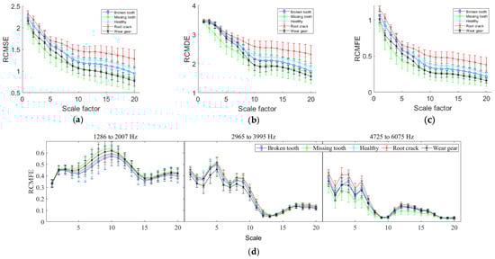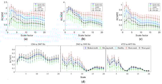 Feature extraction by different methods with original vibration data. (a) RCMSE; (b) RCMDE; (c) RCMFE; and (d) AMBPF-RCMFE (some of BPF).
