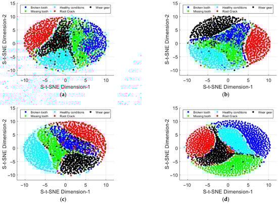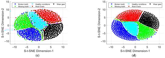 Since multi-scale entropy requires the joint comparison of differences across multiple scales to distinguish different states, it is difficult to intuitively observe the advantages and disadvantages of each fault feature extraction method. To address this problem, supervised t-stochastic neighbor embedding (S-t-SNE) [50] is utilized for visual dimensionality reduction in this paper. The results after S-t-SNE dimensionality reduction are shown in Figure 10 and Figure 11.