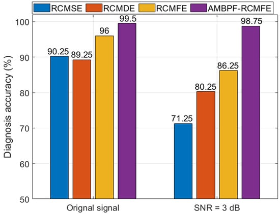 It can be seen from Figure 12 that without adding additional noise, the fault diagnosis accuracy rates based on RCMSE and RCMDE are 90.25% and 89.25%, respectively. However, when the noise level increases, the fault diagnosis accuracy rates drop significantly. The fault diagnosis accuracy rate based on RCMFE performs satisfactorily without additional noise, reaching 96%, but only 86% under the condition of 3 dB of additional noise. The AMBPF-RCMFE feature extraction method proposed in this paper shows good fault diagnosis performance in both cases, with the fault diagnosis accuracy rates reaching 99.5% and 98.75%, respectively. The above results show that the proposed feature extraction method can effectively extract the operational characteristics of the planetary gearbox and has strong noise suppression capability.