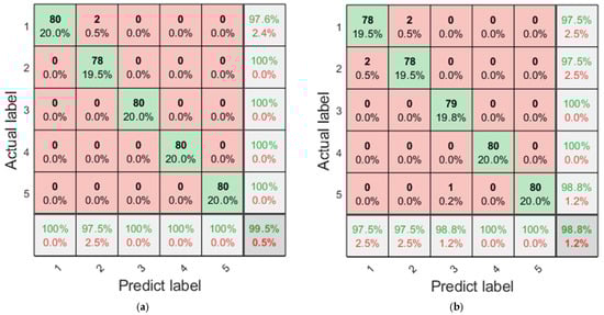 The confusion matrix for the diagnosis results of the proposed fault diagnosis method. (a) Original signal; (b) SNR = 3 dB. (The meanings of the labels: 1—broken tooth, 2—missing tooth, 3—healthy, 4—root crack, and 5—wear gear.)