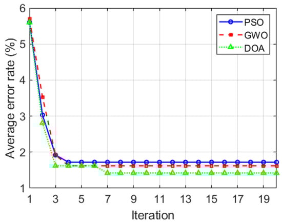 In this section, verification research is conducted on the DOA-LSSVM proposed in this paper. Firstly, to demonstrate the superiority of the DOA, it was compared with PSO and GWO in optimizing LSSVM. The parameters of different optimization algorithms are listed in Table 2. Figure 14 shows the convergence curves of the average misdiagnosis rate for the LSSVM models optimized by different algorithms over 10 runs.