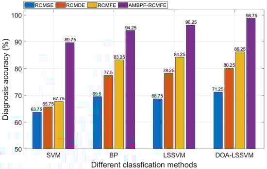 It can be observed from Figure 15 that, regardless of the classification method, the fault feature extraction method proposed in this paper outperforms the feature extraction methods of RCMSE, RCMDE, and RCMFE. Under the same feature extraction method, the performance of the proposed DOA-LSSVM is superior to that of the BP neural network, SVM, and LSSVM. The above results indicate that the proposed DOA-LSSVM fault diagnosis method possesses an excellent classification capability.