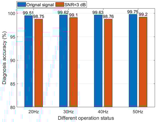 - The proposed method exhibits strong noise suppression capability. The fault diagnosis accuracy rates reach 98.75% with an additional 3 dB of noise. Meanwhile, it achieves high diagnostic efficiency under different operating conditions and rotational speeds; the accuracy rate of fault diagnosis exceeds 99.51% and 98.75% in the absence of additional noise and in the presence of additional noise, respectively.