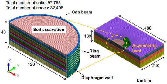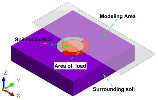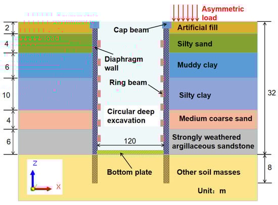 Take into account the material stacking that may occur during the construction process. According to the calculation of the construction unit, during the construction period, a surface load of 30 kPa will be generated within a radius of 30 m around the deep excavation (the form of the load is vertical and a downward uniformly distributed load). The load distribution diagram is shown in Figure 2. This belongs to a typical problem of symmetrical structures under asymmetric loads [14,25,51,52]. The supporting structure mainly consists of diaphragm wall, cap beam (referred to as ring beam 1), ring beams, and bottom plate. Among them, there are a total of 8 ring beams, with a longitudinal spacing of 4 m. The materials of the supporting structure are all reinforced concrete. The thickness, total height, and embedding depth of the diaphragm wall are 1.5 m, 40 m, and 8 m, respectively. In addition, the simplified soil layer consists of a total of 8 layers. From top to bottom, respectively, they are artificial fill, silty sand, muddy clay, silty clay, medium-coarse sand, strongly weathered argillaceous sandstone, moderately weathered argillaceous sandstone, and micronized argillaceous sandstone. The specific contents of soil layer parameters are listed in Table 1. The relevant parameters of the supporting structure are illustrated in Table 2. It should be noted that the soil material parameters shown in Table 1 are derived from the engineering geological investigation report and the triaxial compression test. Among them, the thickness of the soil layer was determined through field drilling exploration. The unit weight of soil is determined through density tests conducted in the laboratory. The cohesion, friction angle, elastic modulus, and Poisson’s ratio are determined through indoor triaxial compression tests. In addition, the material parameters involved in Table 2 are provided by the manufacturer. Furthermore, each excavation was carried out after the water had fallen 3 m below the excavation face. Therefore, the influence of groundwater on excavation is not considered in this study.