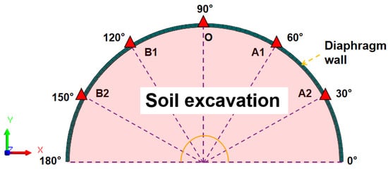 It is important to note that the diaphragm wall is one of the most crucial structural components in deep excavation engineering [50,51,52]. The deformation and force on the diaphragm wall can not only indirectly reflect the surface settlement situation [11,12,13,14], but also determine the safety situation of the deep excavation during the construction process [18,19,20]. Obviously, deep excavation construction and the action of asymmetric loads may have certain influences on the deformation and force of the diaphragm wall. In view of this, the deformation and force-bearing issues of the diaphragm wall are of crucial importance. Therefore, during the actual construction process, multiple monitoring points were set up for the diaphragm wall. Representative locations were selected as monitoring points in this study. The specific locations of the monitoring points are shown in Figure 4. As depicted in Figure 4, there are a total of five monitoring points for the diaphragm wall in this study. They are, respectively, O, A1, B1, A2, and B2. Among them, both A1 and A2 are located in the middle of the asymmetric load layout area. Both B1 and B2 are located in the middle of the no-load layout area, and O is located in the middle of the deep excavation. The included angle of each monitoring point is 30°.