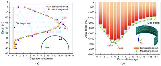 Figure 5 presents the comparison between the simulated values and the monitored values. Figure 5a is a comparison chart of the total displacement of monitoring point A1 when the excavation is completed. Obviously, the results of both methods exhibit a “bulging belly” feature. This research conclusion is consistent with reference [25]. In terms of the maximum value, the monitored value and the simulated value are 14.2 mm and 13.1 mm, respectively. The maximum values all occur at a position of −16 m below the surface. It is not difficult to find that the on-site monitoring results are larger, with a difference of 8.4% between the two. Figure 5b indicates the comparison of the maximum axial forces of the cap beam at different excavation stages. By comparison, it can be seen that the results of both methods also exhibit a “funnel” feature. The maximum values of the monitored value and the simulated value are −3863 kN and −3648 kN, respectively. The maximum values all occur in step 5. The on-site monitoring results are even greater, with a difference of 5.9% between the two. To sum up, the numerical simulation results are in good agreement with the monitoring results. The reliability of the model established in this research was verified. Furthermore, the displacement values are all less than the requirements of the specifications, and the deep excavation is in a safe state [34,35].
