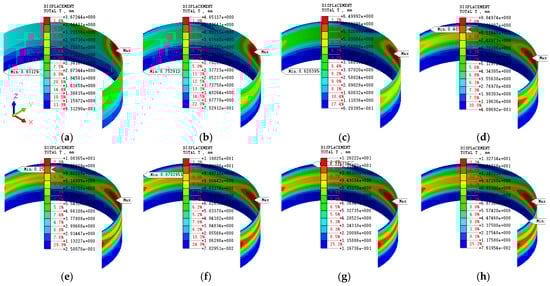 Total displacement cloud map: (a) Stage 1; (b) Stage 3; (c) Stage 5; (d) Stage 8; (e) Stage 9; (f) Stage 11; (g) Stage 13; (h) Stage 16.