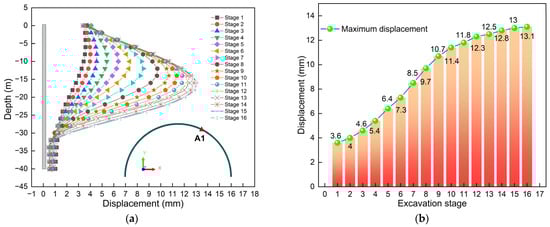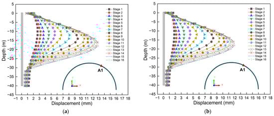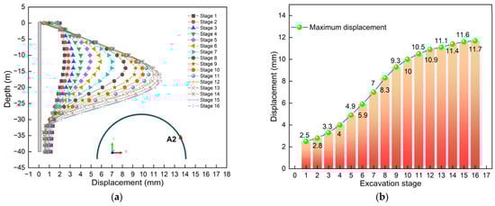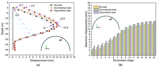 Figure 9b is a bar chart comparing the maximum displacement. Obviously, the maximum value shows a pattern of “increasing rapidly first and then slowly”. The increase was the largest in stage 1, which was 2.5 mm. This also indicates that asymmetric loads and excavation have the greatest influence on stage 1. By comparison, it can be found that, at stage 1, the maximum displacement of A1 is 44% greater than that of A2. Furthermore, the maximum displacement occurred when the excavation was completed, which was 11.7 mm. When the excavation is completed, the maximum displacement of A1 is 12% greater than that of A2. This might be because A1 and A2 are in different positions. Therefore, the influence of asymmetric loads on them is also different.