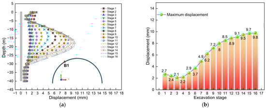 Figure 8 illustrates the displacement comparison chart of monitoring point B1. Figure 8a is the displacement curve graph. Obviously, at different stages, the displacement curves present different characteristics. But overall, it presents an “S” shape. This is somewhat different from the shape presented in Figure 7a. Specifically, during the first three stages, the maximum value occurs at the top of the diaphragm wall. This might be because, during these stages, the excavation depth is relatively small and there is no asymmetric load acting on the soil near B1. This is the result of the combined action of excavation and asymmetric loads. In addition, it can be found that the position where the maximum value occurs shows a continuous downward trend with excavation. When the excavation was completed, the maximum displacement also occurred at a position of −16 m below the surface. The position where the maximum value occurs is close to A1 (see Figure 7 for details). This indicates that asymmetric loads have a relatively small influence on the location where the maximum displacement of the diaphragm wall occurs. Furthermore, the displacement at the same position keeps increasing with the increase in the construction depth of the deep excavation. It is worth noting that, at different construction steps, there is displacement at the top of the diaphragm wall, and the displacement is close to 3 mm. Obviously, the top displacement of B1 is less than that of A1. This also indicates that asymmetric loads have a greater impact on the top displacement of the diaphragm wall in the load action zone.