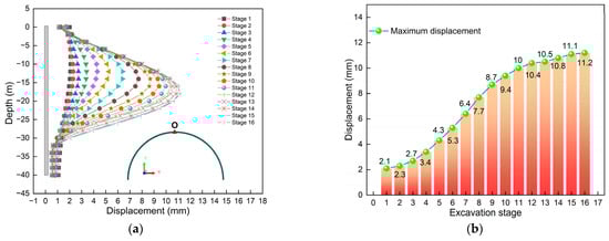 Figure 11b is a bar chart comparing the maximum displacement. Obviously, the maximum value shows a pattern of “increasing rapidly first and then slowly”. By comparison, it can be found that the maximum increase is the largest at stage 1, which is 2.1 mm. This also indicates that asymmetric loads and excavation have had the greatest impact on stage 1. Furthermore, the maximum displacement occurs when the excavation is completed, which is 11.2 mm. This also indicates that asymmetric loads have a greater impact on the initial construction of the deep excavation in the load action area, while having a relatively smaller impact on the later construction of the deep excavation.