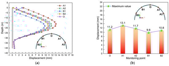 Figure 12 illustrates the comparison of the diaphragm wall displacement. Figure 12a presents the comparison curve of the total displacement. Obviously, when the excavation is completed, the displacements of different monitoring points of the diaphragm wall are not the same. The displacement curve of monitoring point A1 shows an “S” feature, while the other monitoring points all show a “belly bulge” feature. This also indicates the complexity of the influence of an asymmetric load on the excavation of circular deep excavations. It can also be found that, at the same position, the order of displacement from largest to smallest is A1, A2, O, B2, and B1. Obviously, the maximum displacements at different monitoring points are different. This once again verifies that the circular diaphragm wall is a three-dimensional spatial structure, and its analysis and calculation is a complex three-dimensional spatial problem [25]. This might be because A1 and A2 are located in the asymmetric load action zone, the O displacement is located in the transition zone, while B1 and B2 are located in the non-load-action zone. The reason why the displacement A2 < A1 might be that, as can be seen from Figure 4, although both A2 and A1 are located in the area directly affected by asymmetric loads, their positions are not the same. Observation reveals that the area of action of asymmetric loads on A1 is larger, while that on A2 is relatively smaller. From the relevant knowledge of structural mechanics, it can be known that the action effect of uniformly distributed loads is positively correlated with the action area of uniformly distributed loads. Therefore, the larger the area where the uniformly distributed load acts, the greater the load effect it generates, which in turn leads to a greater impact on A1, and thus shows the phenomenon that the displacement A2 < A1. Furthermore, the reason why the displacement B1 < B2 might be that, as can be seen from Figure 4, although neither B2 nor B1 is in the direct action area of the asymmetric load, their positions are not the same. Under the action of asymmetric load, the diaphragm wall in the load area has a tendency to deform towards the inside of the deep excavation, and the diaphragm wall is connected with the ring beam, so the ring beam will also move towards the inside of the deep excavation. This kind of movement deformation will cause the displacement far from the area affected by asymmetric loads to be suppressed, and this suppression effect decreases as the distance from the asymmetric action area increases. Obviously, B1 is closer to the area where the asymmetric load acts, so the phenomenon of displacement B1 < B2 occurs. This once again indicates that the influence of asymmetric loads on the diaphragm wall has a spatial effect, and the impact of asymmetric loads is greater. Figure 12b is a comparison chart of the maximum displacement when the excavation is completed. Obviously, the maximum displacements of different monitoring points vary, presenting a characteristic of “fluctuating changes”. The maximum value appears in A1, with a value of 13.1 mm. The minimum value appears in B1, with a value of 9.8 mm. The reason is the same as that in Figure 12a.