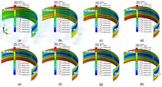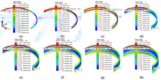 Axial force cloud map of the ring beam: (a) Stage 1; (b) Stage 3; (c) Stage 5; (d) Stage 8; (e) Stage 9; (f) Stage 11; (g) Stage 13; (h) Stage 16.