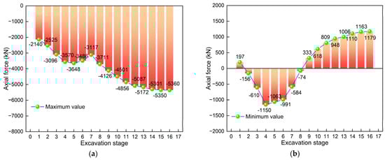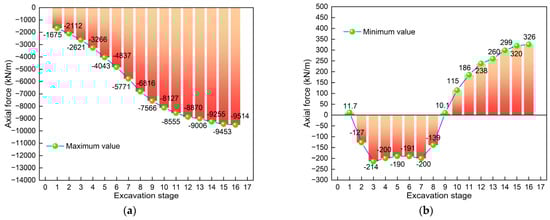 Figure 22 presents the axial force comparison bar graph of the ring beam. Figure 22a is a comparison chart of the maximum axial force. Obviously, at different stages, the axial force values are different, presenting the characteristics of “first increasing rapidly, then decreasing, and finally increasing slowly”. The maximum value occurs when the excavation is completed. The maximum axial forces are all negative, which indicates that the axial force of the ring beam is mainly compression. By comparison, it can be found that the increase is the largest in stage 1, which is 2140 kN. This also indicates that the asymmetric load and excavation have the greatest impact on the axial force in stage 1. Figure 22b is a comparison chart of the minimum axial force. At different excavation stages, the axial force values are also different, showing the characteristics of “first increasing, then decreasing, and then increasing again”. The maximum value also occurs when the excavation is completed. The minimum values can be both positive and negative, which indicates that, in addition to being compressed, some areas of the ring beam are also under tension. It can also be found that the maximum increase occurs in stage 4, which is 540 kN. This indicates that the construction in stage 4 has the greatest impact on the axial force. Furthermore, it can be found that the maximum and minimum values of the axial force are −5360 kN and 1179 kN/m, respectively. This indicates that the axial force generated during the excavation process is mainly compression. To sum up, the axial force of the ring beam during the excavation process is mainly compression. The increase in axial force is the greatest in stages 1 and 4, which requires attention in design and construction.