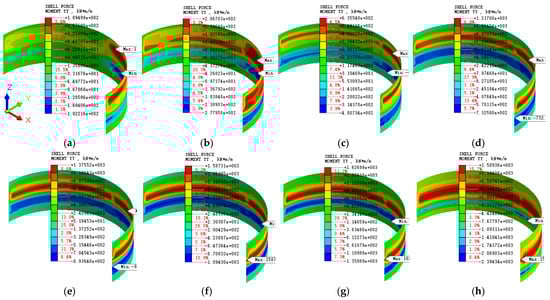 Bending moment cloud map: (a) Stage 1; (b) Stage 3; (c) Stage 5; (d) Stage 8; (e) Stage 9; (f) Stage 11; (g) Stage 13; (h) Stage 16.
