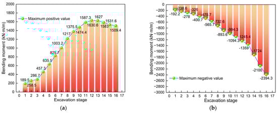 Figure 16 illustrates the bar chart of bending moment comparison. Figure 16a is a comparison chart of the maximum normal bending moment. Obviously, at different excavation stages, the bending moment values also vary, showing the feature of “increasing first and then decreasing”. The maximum normal bending moment occurs at stage 12. This phenomenon is different from the result under symmetrical loading [22,23]. This might be the effect produced under the action of asymmetric loads. By comparison, it can be found that the maximum increase is the largest at stage 1, with an increase of 189.5 kN·m/m. This also indicates that the asymmetric load and excavation have the greatest impact on the maximum normal bending moment in stage 1. Figure 16b is a comparison chart of the maximum negative bending moment. Obviously, at different excavation stages, the bending moment values also vary, showing the characteristic of “slowly increasing at first and then rapidly increasing”. The maximum value occurred when the excavation was completed, which was −2394.3 kN·m/m. It can also be found that the increase in working conditions 14, 15, and 16 are relatively large. The maximum increase occurs in working condition 15, with an increase of 376 kN·m/m. This indicates that the construction of the last three stages has the greatest impact on the maximum negative bending moment. Furthermore, it can be found that the maximum positive and negative values of the bending moment are 1509.4 kN·m/m and −2394.3 kN·m/m, respectively. Obviously, the absolute value of the maximum negative bending moment is larger, with a difference of 59% between the two. This indicates that the maximum bending moment generated during the excavation process is negative. Therefore, during the design and construction phases, it is necessary to pay close attention to the areas where the diaphragm wall experiences the maximum negative bending moment. If necessary, measures can be taken to reduce the adverse impact of excavation on the supporting structure.