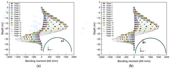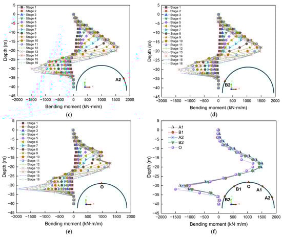 In order to present the variation in the bending moment of the diaphragm wall in more detail, we extracted the calculation results and drew the curve graph related to the bending moment. It should be noted that representative monitoring points were selected for this study. The specific distribution of the monitoring points is shown in Figure 4. Figure 17 presents the comparison curve of bending moments of the diaphragm wall. Figure 17a–e illustrate the bending moment curves at different monitoring points. It can be seen that, although the bending moment values at different monitoring points may vary, they generally present a “bow knot” feature. The normal bending moment mainly occurs within the range of 0 to −22 m, with the maximum value at the position of −20 m. The negative bending moment is mainly concentrated within the range of −22 m to −35 m. The maximum value occurs at the position of −30 m. It is worth noting that the bending moment values at the top of the diaphragm wall and within the range of −35 m to −40 m are 0. This indicates that the design of the supporting structure in this study is reasonable. Figure 17f illustrates the comparison curve of bending moments at different monitoring points when the excavation is completed. It can be seen that the maximum normal bending moments, from largest to smallest are A1, A2, B1, B2, and O. The difference is that the absolute values of the maximum negative bending moment, from largest to smallest, are O, A1, A2, B2, and B1. It can be observed that the sequence of the maximum positive and negative bending moment from largest to smallest is not the same.