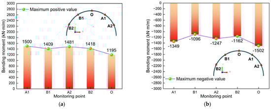 Figure 18 illustrates the bending moment comparison bar chart of the diaphragm wall. Figure 18a shows the comparison of the maximum normal bending moments at different monitoring points when the excavation is completed. It can be seen that different monitoring points result in different bending moment values. The maximum positive values of A1, B1, A2, B2, and O are, respectively, 1500 kN·m/m, 1409 kN·m/m, 1481 kN·m/m, 1418 kN·m/m, and 1195 kN·m/m. Obviously, the value of A1 is the largest and that of O is the smallest, with a difference of 26% between the two. This indicates that excavation under asymmetric loading has the greatest impact on monitoring point A1. Figure 18b presents the comparison of the maximum negative bending moments at different monitoring points when the excavation is completed. It can be seen that different monitoring points result in different bending moment values. The maximum negative values of A1, B1, A2, B2, and O are, respectively, −1349 kN·m/m, −1096 kN·m/m, −1247 kN·m/m, −1162 kN·m/m, and −1502 kN·m/m. Obviously, the value of O is the largest and that of B1 is the smallest, with a difference of 37% between the two. This indicates that excavation under asymmetric loading has the greatest impact on monitoring point O. In conclusion, excavation under asymmetric loads has the greatest impact on monitoring points A1 and O, which requires attention during design and construction. This once again verifies that the circular diaphragm wall is a three-dimensional spatial structure, and its analysis and calculation is a complex three-dimensional spatial problem [25]. If solved as a planar problem without considering the three-dimensional force and deformation characteristics brought by the spatial effect of the circular retaining wall, the research results may have significant limitations [33,35,48].