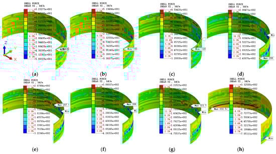 Shear force cloud map: (a) Stage 1; (b) Stage 3; (c) Stage 5; (d) Stage 8; (e) Stage 9; (f) Stage 11; (g) Stage 13; (h) Stage 16.