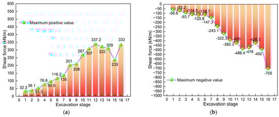 Figure 20 is a bar chart of shear force comparison. Figure 20a is a comparison chart of the maximum positive shear force. Obviously, at different excavation stages, the shear force values are also different, presenting the feature of “first increasing, then decreasing, and then increasing again”. The maximum positive shear force occurs when the excavation is completed. By comparison, it can be found that the maximum increase is the greatest at stage 16, which is 98 kN/m. This also indicates that the asymmetric load and excavation have the greatest impact on the maximum positive shear force in stage 16. Figure 20b is a comparison chart of the maximum negative shear force. Obviously, at different excavation stages, the shear force values are also different, presenting the feature of “first increasing, then decreasing, and then increasing again”. The maximum value also occurred when the excavation was completed, which is −705 kN/m. It can also be found that the maximum increase occurs in stage 16, which is 213 kN/m. This indicates that the construction in the final stage has the greatest impact on the shear force. Furthermore, it can also be found that the maximum positive and negative values of the shear force are 333 kN/m and −705 kN/m, respectively. The absolute value of the maximum negative shear force is larger. The difference between the two is 111%. This indicates that the maximum shear force generated during the excavation process is negative. At stage 16, the increase in shear force is the greatest, which requires attention in the design and construction.