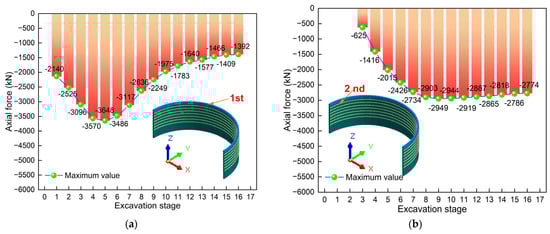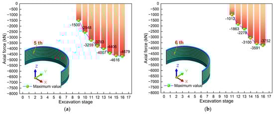Figure 25 illustrates the comparison of the axial forces of ring beams 5 and 6. Figure 25a shows the comparison diagram of the maximum axial force of ring beam 5. Obviously, the axial force value varies at different stages, showing the characteristic of “increasing rapidly at first and then slowly”. The maximum axial force occurred when the excavation was completed, with a value of −4679 kN. The maximum axial forces are all negative, which indicates that the axial force of ring beam 5 is mainly compression. By comparison, it can be found that the increase is the largest at stage 9, with a value of 1500 kN. This also indicates that the asymmetric load and excavation have the greatest impact on the maximum axial force in stage 9. Figure 25b presents the comparison diagram of the maximum axial force of ring beam 6. Obviously, the axial force value varies at different stages, showing the characteristic of “increasing rapidly at first and then slowly”. The maximum value also occurred when the excavation was completed, with a value of −3752 kN. The maximum values are all negative, which indicates that ring beam 6 is mainly under compression. It can also be found that the maximum increase occurs in stage 11, which is 1530 kN. This indicates that the construction in stage 11 has the greatest impact on the axial force. To sum up, the axial force of ring beams 5 and 6 during the excavation process is mainly compression. The increase in axial force is the greatest at stages 9 and 11, which requires attention in design and construction.