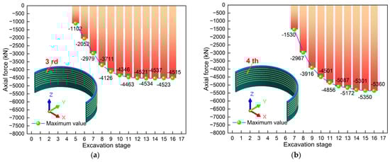 Figure 24 presents the axial force comparison diagram of ring beam 3 and 4. Figure 24a illustrates the comparison diagram of the maximum axial force of ring beam 3. Obviously, the axial force value varies at different stages, showing the characteristic of “increasing rapidly at first and then tending to stabilize”. The maximum axial force occurs at stage 14, with a value of −4537 kN. The maximum axial forces are all negative, which indicates that the axial force of ring beam 3 is mainly compression. By comparison, it can be found that the increase is the largest at stage 5, with a value of 1102 kN. This also indicates that the asymmetric load and excavation have the greatest impact on the axial force in stage 5. Figure 24b shows the comparison of the maximum axial forces of ring beam 4. Obviously, at different stages, the axial force values also vary, showing the characteristic of “increasing rapidly at first and then slowly”. The maximum value also occurs when the excavation is completed, with a value of −5360 kN. The maximum values are all negative, which indicates that ring beam 4 is mainly under compression. It can also be found that the maximum increase occurs in stage 7, with a value of 1530 kN. This indicates that the construction in stage 7 has the greatest impact on the axial force. To sum up, the axial force of ring beams 3 and 4 during the excavation process is mainly compression. The increase in axial force is the greatest at stages 5 and 7, which requires attention in design and construction.