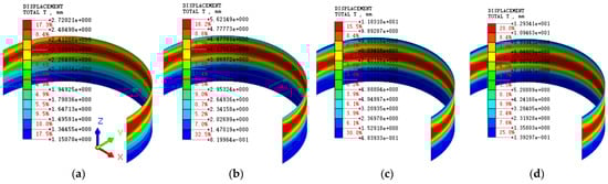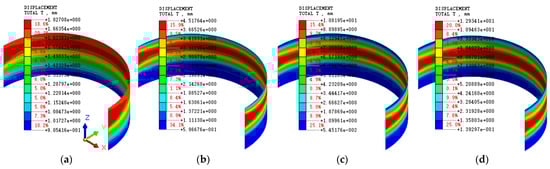 Cloud diagram of total displacement under symmetric load: (a) Stage 1; (b) Stage 5; (c) Stage 11; (d) Stage 16.