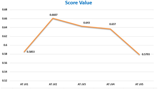 - Score Values: The second column of Table 5 shows the total efficiency of the four options with respect to the four criteria. We may obtain the score value for each option by applying the ranking principle and scoring function to each entry in the second column, as indicated in Table 5’s third column. The final scores for the four choices are as follows: