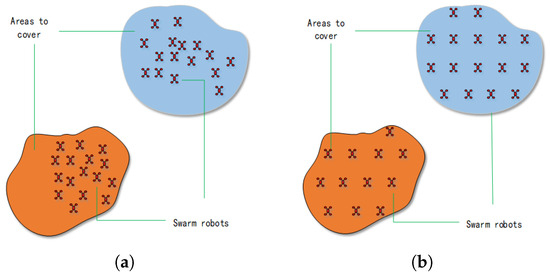 Scenario of swarm robots performing coverage tasks. (a) The initial distribution of swarm robots. (b) The adjusted distribution of swarm robots.