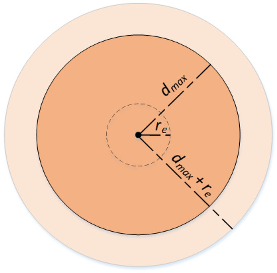 - Because robots are able to move, when the number of robots is not enough to cover the target area, the robots must be able to move themselves to patrol the surrounding areas, which means that the coverage area will be expanded to a certain extent. Assuming that the patrol radius of robot α is , the maximum coverage radius of robot α is , as shown in Figure 2. To further supplement Formula (1), for a certain pixel and a certain body robot α in the area, the definition of whether the pixel is covered by the individual robot α is updated to Formula (1).