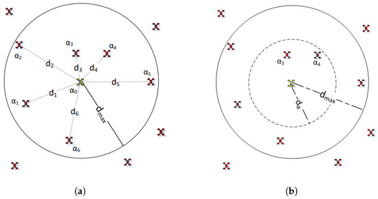 The distance relationships between each robot and its neighboring robots are shown in Figure 3. Intuitively, represents the minimum distance between and the surrounding robot , and it is also the DVF range of the individual robot. Let be the distances from to , it can be seen from Figure 3 that only two robots are in the range of , which means that only these two robots will produce a virtual repulsive force towards robot .