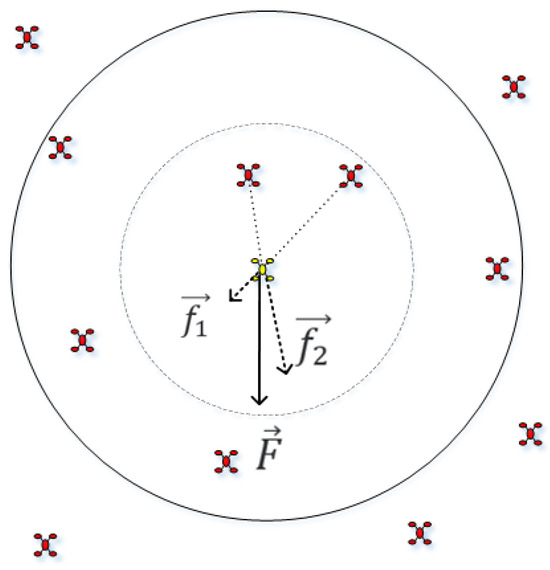 Driven by the goal of expecting to maintain an average distance from all surrounding robots, once the distance between the robot around robot and is less than , a corresponding virtual repulsive force is generated by robot , and the vector means that means the force of on in the x-axis direction, and means the force of on in the y-axis direction. The specific calculation of the virtual force between robots is shown in Formula (8).