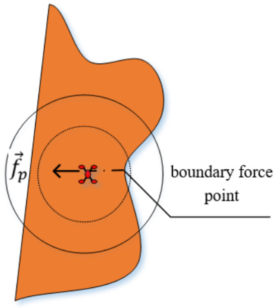 Additionally, when the robot is in the range where it can perceive the area’s boundary, several points can be extracted from the boundary of the area within the perceptive range of the robot, and a virtual repulsive force is generated for the approaching robot through these boundary points. The boundary of the area can restrain all the robots in its range. Each robot uses the closest point in its perception boundary to generate a boundary force point, and each boundary point can only act on the robot that is closest to it, as shown in Figure 5.