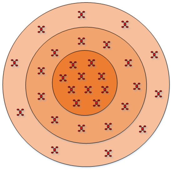 (Coverage density T). The number of robots in the area D to cover is , so the number of robots per unit area in the area is the coverage density of the area, defined as Formula (3). In some practical applications, the number of robots required varies depending on the mission requirements, such as cleaning up oil pollution in the ocean, where areas with high levels of pollution require more robots. In this case, we divide the region into n sub-regions with densities of according to the demand, and high-density areas tend to require more robots.