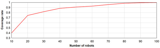 Finally, Table 9 compares various methods of swarm robots’ area coverage, the experimental setting is the same as at the beginning of Section 4. We can find that for these area coverage algorithms, large-scale areas and complex areas are considered. Still, most algorithms do not consider regional changes or the existence of sub-areas with different densities in the region. The algorithm proposed in this paper can perform well in various conditions, and the coverage rate and speed are better than most of the algorithms we compared it to.
