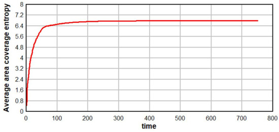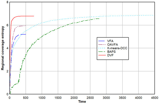 The uniformity of area coverage can be evaluated by defining the area coverage entropy, which reflects whether the distance between all robots in the swarm robot system covering the area is consistent. Figure 22 shows the four methods can achieve uniform coverage. Still, the DVF method can achieve uniform coverage quickly, and the coverage entropy is the largest; the K-means-DCC method is the second largest, and the BAPS method is the slowest.