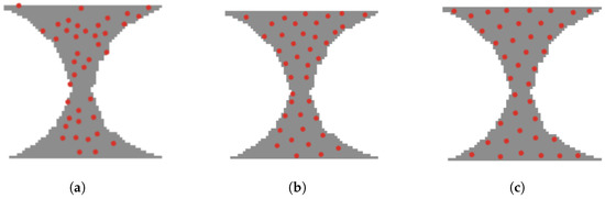 The swarm robot system enters the region through self-organization mode for the unknown environment. The system is initially in a state of random and uneven distribution. To adapt to the pattern of the region, a rapid regional adaptive adjustment mechanism enables the robots to distribute over the area evenly. In the case of an area that is changing rapidly, the swarm robots must be able to adapt quickly to ensure uniform coverage. Figure 1 shows the scene of covering tasks in various areas of the swarm robots. Figure 1a shows the initial distribution of the swarm robots system in the required coverage area, and the robots do not cover the area uniformly. Figure 1b shows the adjusted distribution of the swarm robots after the adjustment of the intra-regional adaptive mechanisms.