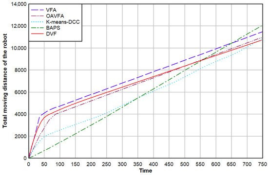Figure 20 shows the total distance that the group of robots moved in the area coverage experiment with each. The moving space of the robot in the K-means-DCC method is smaller than that in the BAPS method. In our DVF method, because the robots repel each other, the robots will be quickly scattered in the initial period, so the distance moved at the beginning is the largest, after a certain period, the growth rate of the total moving distance of the robot is lower than that of the K-means-DCC method and the BAPS method.