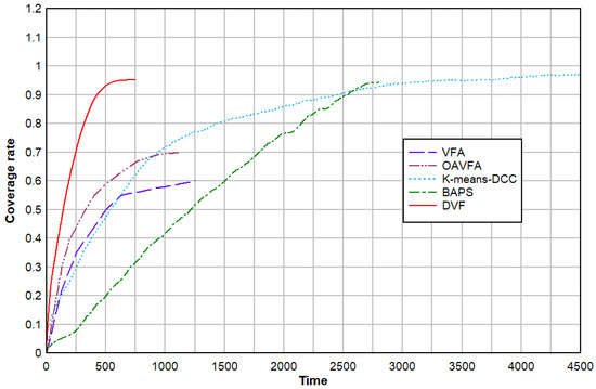 In the context of the environment introduced at the beginning of Section 4, the DVF method proposed in this paper is compared with four area coverage algorithms that use different approaches, including VFA algorithm [27], OAVFA algorithm [28], K-means-DCC algorithm [43], and BAPS algorithm [36]. For comparison, the main performance comparisons include coverage rate, total robot movement distance, coverage uniformity (coverage entropy) and time required for convergence.