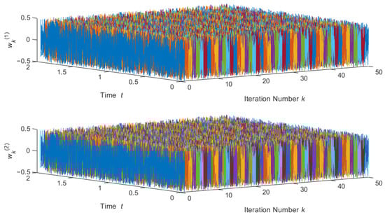 However, most existing iterative learning control designs require that the system object, initial state, reference trajectory, and test length in the iterative learning control process remain constant as the number of iterations increases [], especially for processing the same test length [,]. In fact, it is difficult to repeatedly perform the same task within a fixed time interval in practice. For example, during underwater robotic seabed inspections, when the multimodal sensor array detects deviations in critical hydroacoustic signal characteristics beyond preset thresholds, the system activates failure determination protocols, terminates the current operation, and autonomously transitions to the next inspection target. Another example is in the field of fully automated precision manufacturing, where semi-finished products undergo a series of processing steps to ultimately form highly integrated end products. This method intertwines the processing and inspection stages in a complex manner; any defect in the processing operation can jeopardize the success of the entire production line, and detecting irreparable faults in semi-finished products during the inspection phase can lead to automatic stoppage of the manufacturing process. Therefore, non-uniform trial lengths are quite common in real life. For non-uniform trial lengths, the average operator technique and modified tracking error are used to provide corresponding iterative learning control algorithms [,], and the robustness and convergence of iterative learning control errors are analyzed using constant norms. On the other hand, most of the research has focused on discrete-time linear systems [,], mainly due to the beneficial system structure and mature discrete random variable analysis techniques. Although for nonlinear systems [], the nonlinear function involved needs to satisfy the global Lipschitz condition.