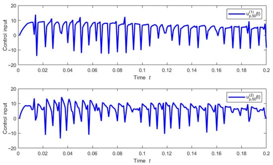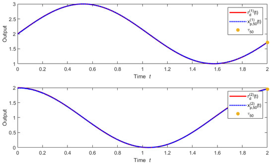 The results satisfy the conditions of the theorem. The adaptive iterative learning algorithm is evaluated using the maximum absolute error. By setting the parameter for the parameter update rule, Figure 2 illustrates the tracking error of the system. Figure 3 shows that the different iteration periods correspond to different lengths of tracking trajectories. It can be observed that, when the iteration count reaches 50, the tracking error of the system approaches 0. Figure 4, Figure 5, Figure 6 and Figure 7 show the trial lengths with different iterations, namely, , , , and showing in Table 1, where represents the desired trial length, which demonstrates how the actual output of the system tracks the expected trajectory under varying iteration counts when subjected to non-uniform trial lengths. Figure 4 shows the actual trajectory and desired trajectory of the vehicle system at the first iteration with trial length . Figure 5 shows the actual trajectory and desired trajectory of the vehicle system at the third iteration with trial length . Figure 6 shows the actual trajectory and desired trajectory of the vehicle system at the 10th iteration with trial length . Figure 7 shows the actual trajectory and desired trajectory of the vehicle system at the 50th iteration with trial length . Notably, when the iteration number is 50, the actual output of the system fully tracks the expected trajectory. Figure 8 shows the control input.