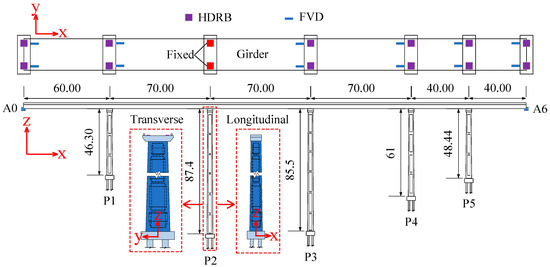 Each box girder is vertically supported on the piers by two high damping rubber bearings (HDRBs). These bearings are placed between the concrete bearing pads on the pier cap beams and the embedded steel plates at the girder bottom. Among all the bridge piers, only pier P2 is a fixed pier, while the others are movable piers. Pier P2 is selected as the fixed pier because it is the tallest pier in the bridge and has a greater flexibility. If a shorter pier is selected as the fixed pier, its higher stiffness would result in smaller deformations under earthquakes, which is more likely to cause seismic damage. The other piers are designed as movable piers, allowing the bridge to undergo deformation during earthquakes. The arrangement of the HDRBs and FVDs is illustrated in Figure 1. The parameters for HDRBs are determined based on vertical loads and Specification JT/T 842-2012 [29].