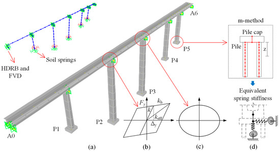 A spatial finite element model of the bridge is established using SAP2000, as shown in Figure 2a. Steel truss girders, piers, pile caps, and girders are modeled using elastic beam elements. Permanent loads primarily include the self-weight of the structure and the second-phase dead loads. HDRBs are represented using the bilinear hysteretic rule (Figure 2b). FVDs are modeled using the symmetric hysteretic rule based on the Maxwell model (Figure 2c) [28]. The pile–soil interaction is accounted for using the m-method (Figure 2d) [30]. The m values are derived from the geotechnical report and Specification JTG 3363—2019 [31], as shown in Table 1.