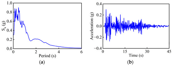 According to the site-specific seismic safety assessment report, the bridge is located on a medium-stiff soil site with a characteristic period of 0.45 s. The peak ground acceleration (PGA) is 0.3 g. The El Centro wave is chosen as the input excitation for the optimization of the FVD. The corresponding acceleration response spectrum and time history are shown in Figure 3.